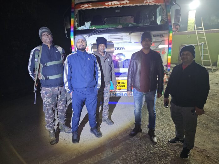 पाकुड़। जिला खनन पदाधिकारी (डीएमओ) राजेश कुमार एवं मुफस्सिल थाना प्रभारी गौरव कुमार ने संयुक्त रूप से अवैध परिवहन के खिलाफ छापेमारी अभियान चलाया। इस छापेमारी अभियान में बिना माइनिंग चालान के गिट्टी लदा एक हाईवा को जब्त किया गया है। इस मामले में थाना प्रभारी गौरव कुमार ने बताया कि डीएमओ के साथ छापेमारी कर एक बिना माइनिंग चालान के चिप्स लदा हाईवा ट्रक को पकड़ा गया है। उन्होंने बताया कि हाईवा संख्या जेएच 16 जे 0663 को पकड़ा गया है। इस मामले में हाईवा मालिक, चालक एवं अन्य लोगों के विरुद्ध प्राथमिकी दर्ज की गई है।