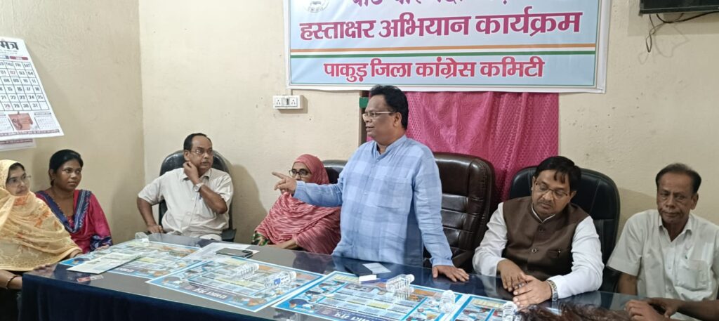 जिला अध्यक्ष श्रीकुमार सरकार, प्रखंड अध्यक्ष मंसारुल हक, प्रदेश सचिव सेमिनूल इस्लाम, प्रखंड पर्यवेक्षक अशोक कुमार दास, शाहीन परवेज, जिला कोषाध्यक्ष असद हुसैन, देबू विश्वास, जिला परिषद सदस्य मंजुला हांसदा, यूथ कांग्रेस जिला अध्यक्ष बिलाल शेख, रामविलास महतो, मीडिया प्रभारी पियारुल इस्लाम, जिला महासचिव अर्धेंदु शेखर गांगुली आदि ने अभियान के बैनर पर हस्ताक्षर किया। इससे पहले आईएनसी के सचिव एवं प्रदेश सह प्रभारी डॉ सिरिवेला प्रसाद तथा प्रदेश कार्यकारी अध्यक्ष शहजादा अनवर ने विधायक निसात आलम की मौजूदगी में कार्यकर्ताओं के साथ वोट चोर गद्दी छोड़ हस्ताक्षर अभियान की सफलता को लेकर बैठक किया। बैठक में कार्यकर्ताओं को संबोधित करते हुए डॉ सिरिवेला प्रसाद ने कहा कि राष्ट्रीय अध्यक्ष मल्लिकार्जुन खड़गे जी एवं राहुल गांधी जी के निर्देश पर देश भर में वोट चोर गद्दी छोड़ हस्ताक्षर अभियान चलाया जा रहा है। देश भर में पांच करोड़ हस्ताक्षर संग्रह करने का लक्ष्य रखा गया है। जिसे राष्ट्रपति के पास भेजा जाएगा।झारखंड में भी अभियान को चलाया जाना है। इसकी शुरुआत आज पाकुड़ से कर दिया गया। पूरे झारखंड में 25 लाख हस्ताक्षर कलेक्ट करना है। उन्होंने कहा कि भारतीय जनता पार्टी चुनाव आयोग के जरिए वोट चोरी कर जनता के मताधिकार के साथ खिलवाड़ कर रहा है। देश के संविधान पर प्रहार किया जा रहा है। उन्होंने कहा कि राहुल गांधी जी ने वोट चोरी के मामले को पूरे तथ्य और सबूत के साथ देश के सामने रखने का काम किया।
